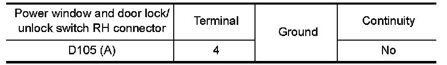 4.Check continuity between power window and door lock/unlock switch RH connector (A) and ground.