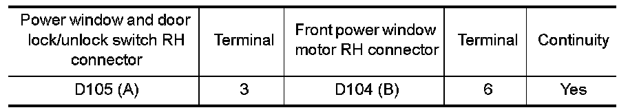 2.Check continuity between power window and door lock/unlock switch RH connector (A) and front power window motor RH connector (B).