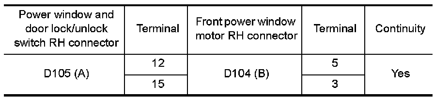 3.Check continuity between power window and door lock/unlock switch RH connector (A) and front power window motor RH connector (B).