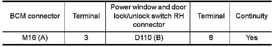 3.Check continuity between BCM connector (A) and power window and door lock/unlock switch RH connector (B).