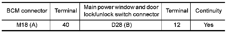 3.Check continuity between BCM connector (A) and main power window and door lock/unlock switch connector (B).
