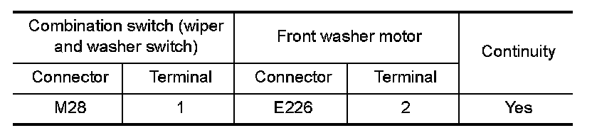 3.Check continuity between combination switch (wiper and washer switch) harness connector and front washer motor.