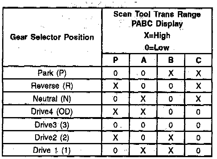 The input voltage level at the PCM is high (B+) when the transaxle range switch is open and low when the switch is closed to ground. The state of each input is represented on the scan tool as X=high voltage level, O=low voltage level. The four parameters represent transaxle range switch Parity, A, B, and C inputs respectively.