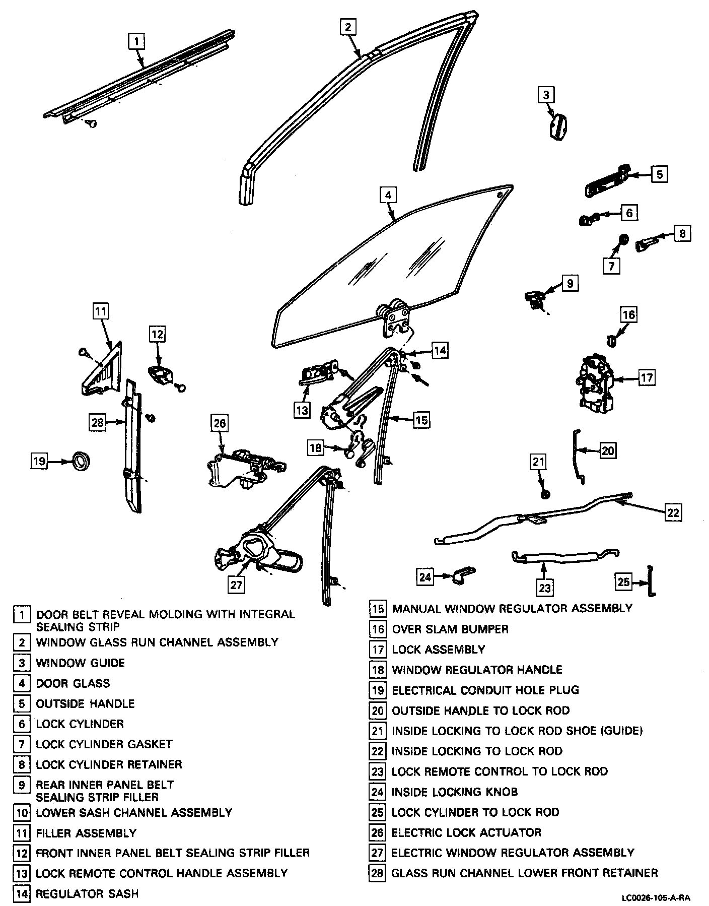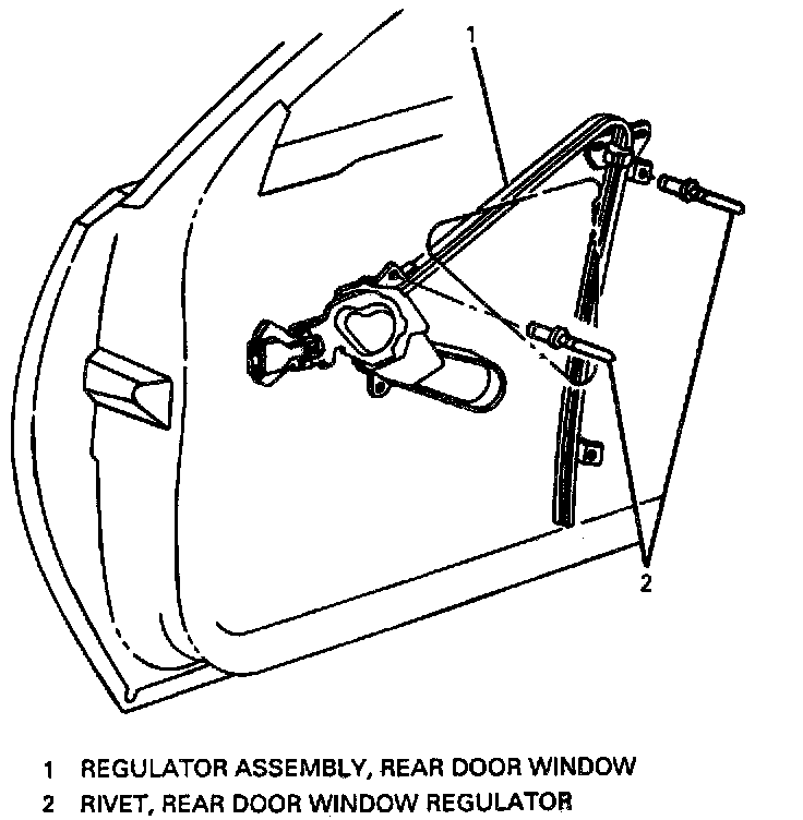 5. For manual regulator, remove regulator through rear access hole. For electric regulator, remove window as stated previously. Move regulator and motor assembly rearward and remove electrical connector. Remove regulator and motor assembly through rear access hole.