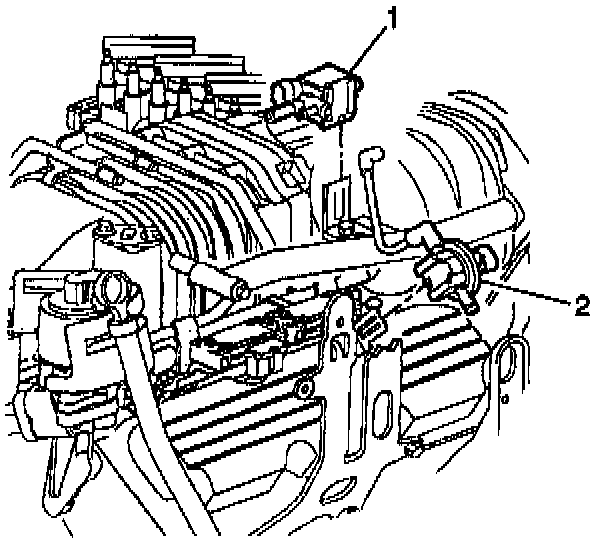 1. Disconnect the electrical connector and the vacuum hoses from the EVAP vacuum switch (2).