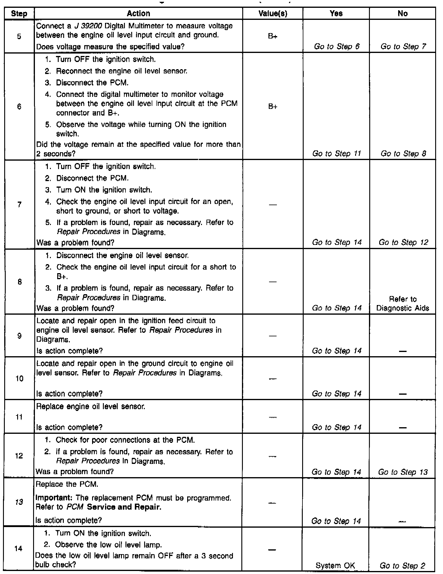 ^ Poor connection at PCM or oil level sensor. Inspect harness connectors for backed out terminals, improper mating, broken locks, improperly formed or damaged terminals, and poor terminal to wire connection.