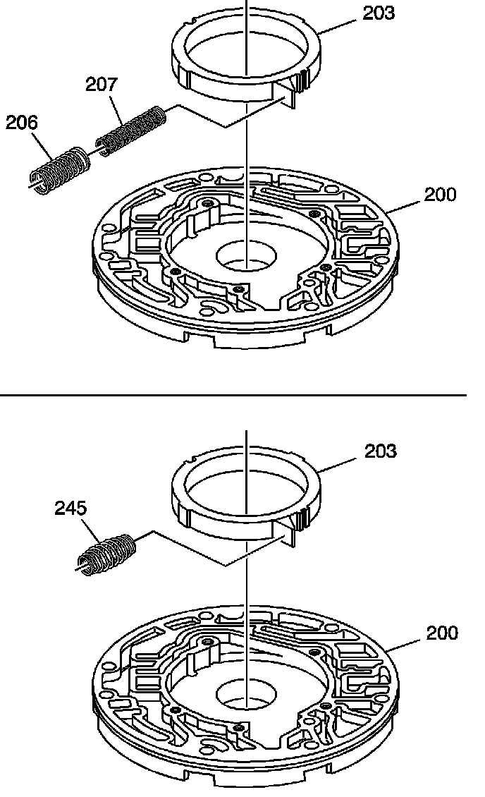 When servicing either (first design or second design) oil pump body, use the new single oil pump spring (245) with tapered ends.