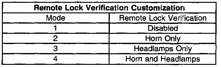 IMPORTANT: If the ignition switch is moved to the OFF position or any vehicle door is opened during this procedure the remote unlock verification customization will be terminated and the system will remain in the most recent mode.