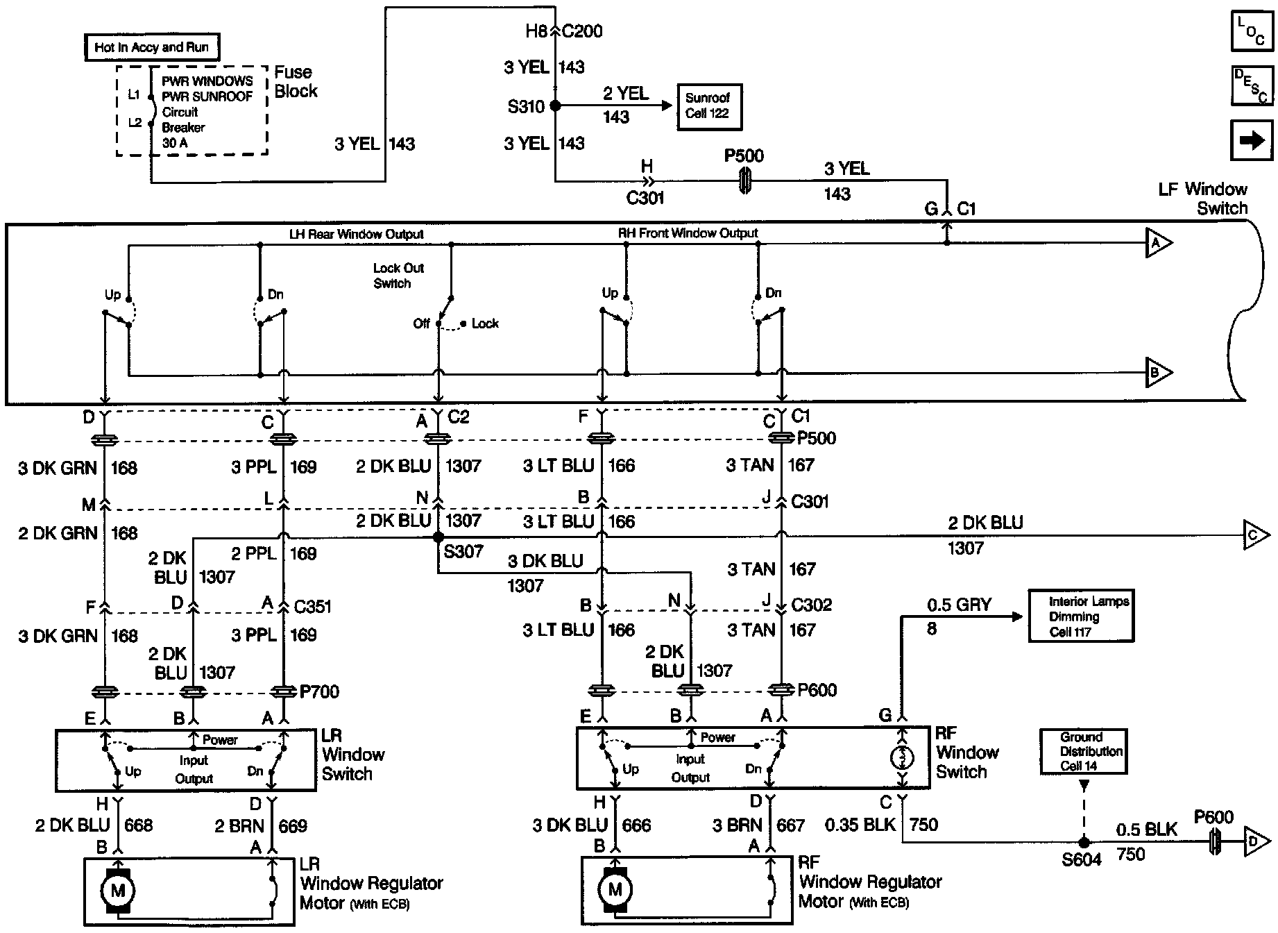 Power Window Schematics: Power Distribution, Window SW & Window Regulator Motors:
