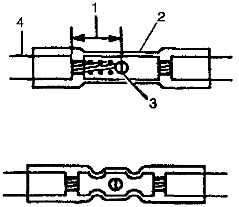 9. Insert the wires into the splice sleeve until the wire hits the barrel stop. The splice sleeve has a stop in the middle of the barrel in order to prevent the wire from passing through the splice (3).
