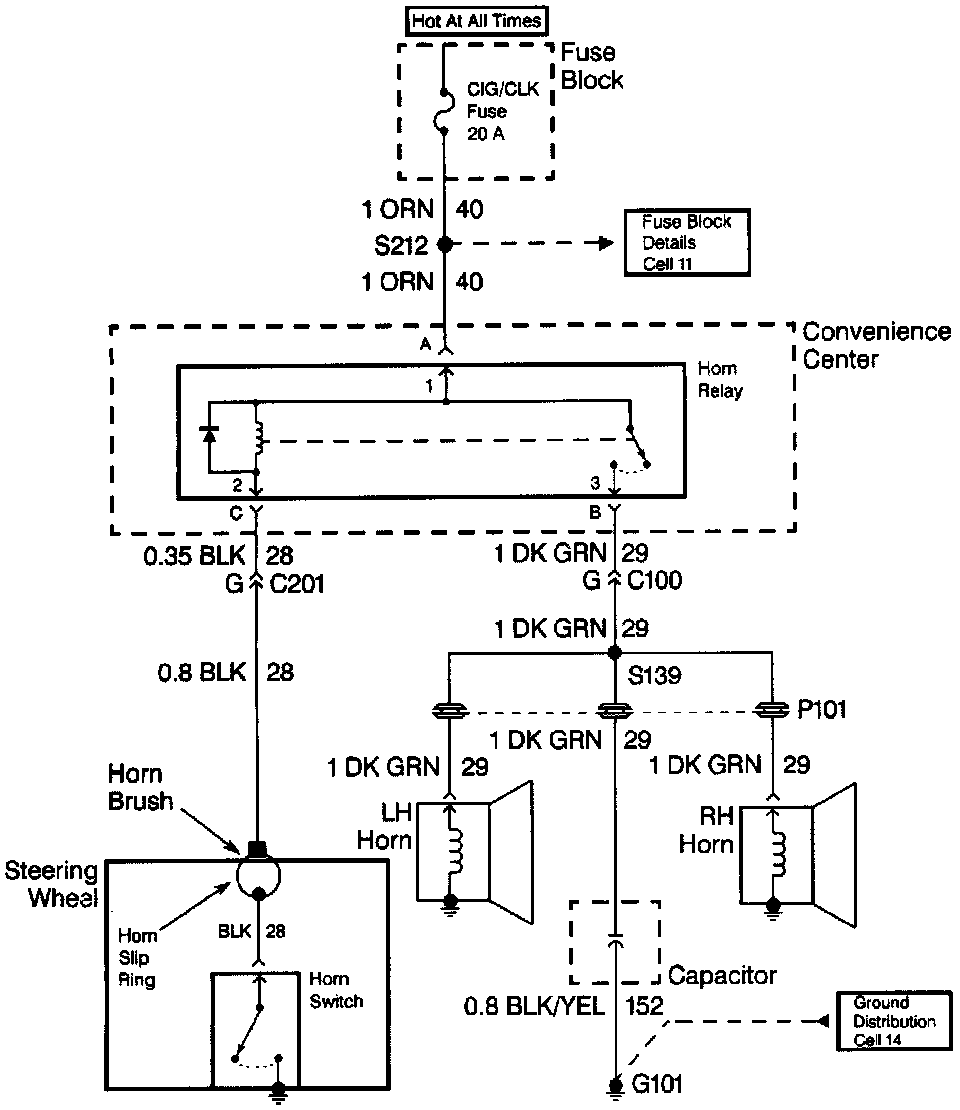 IMPORTANT: The schematic does not represent the components and wiring as they physically appear on the vehicle. For example, a 4-foot length of wire is treated no differently in a schematic from one which is only a few inches long.When diagnosing a horn problem use the service information located in the Horns service category. The following schematic is a typical example of a schematic with its supporting text.