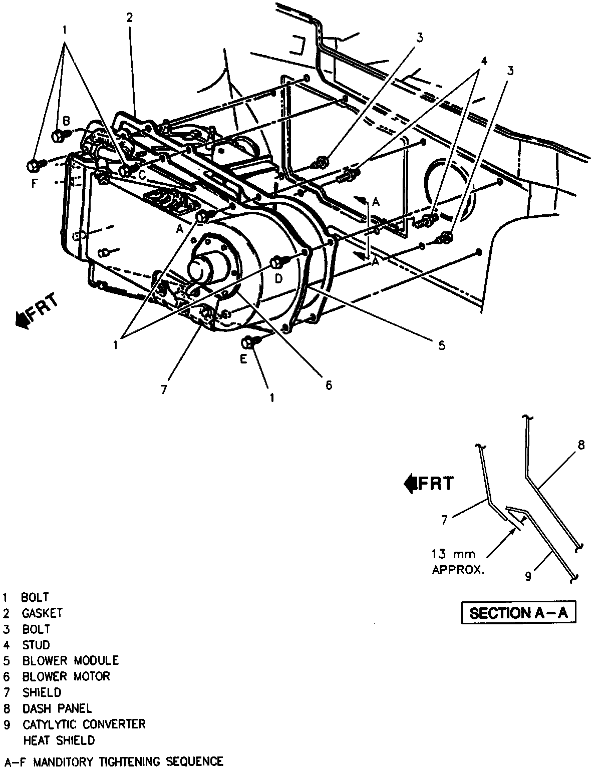 12. Bolt attaching heater and A/C module assembly to front of dash.