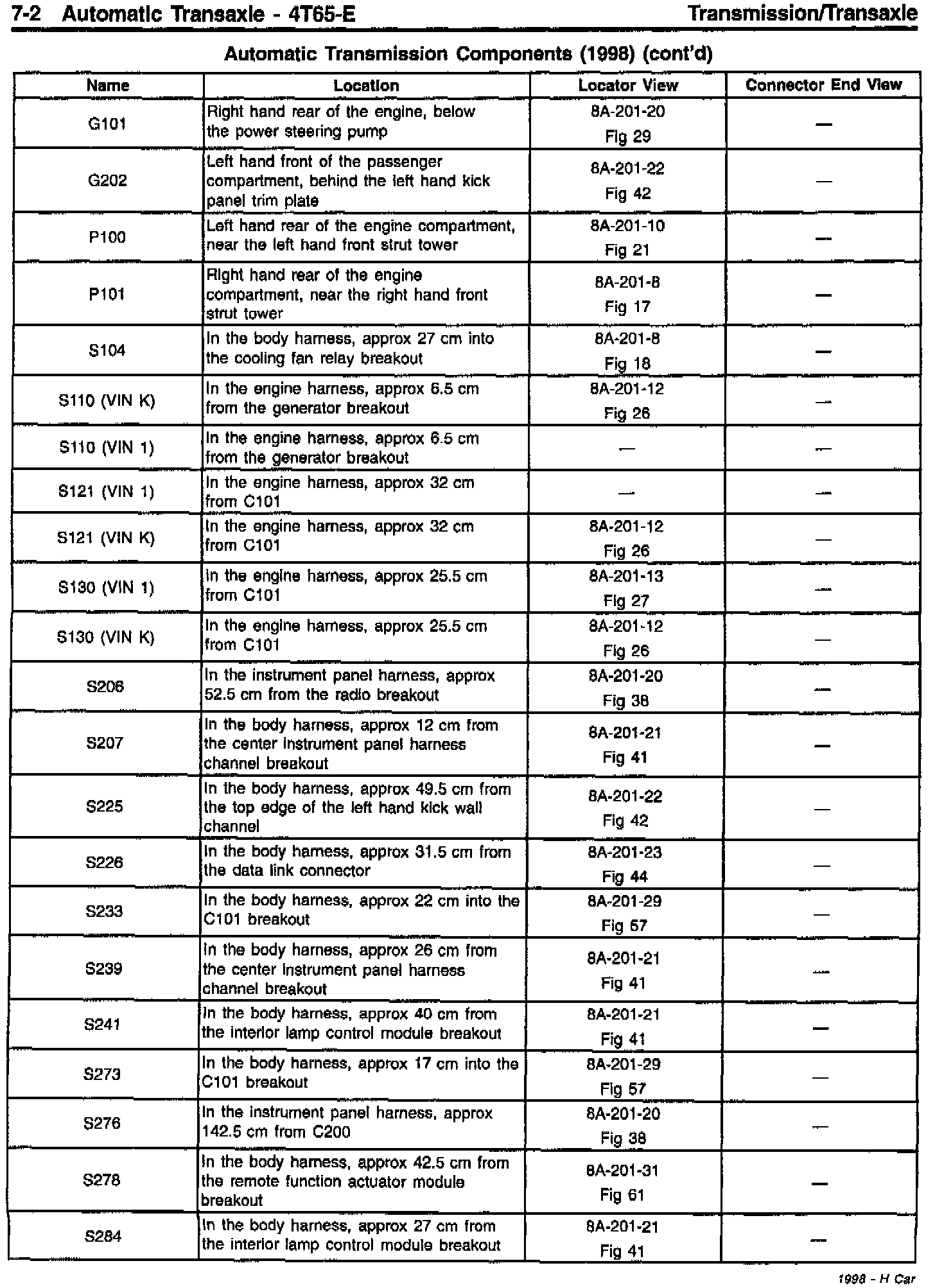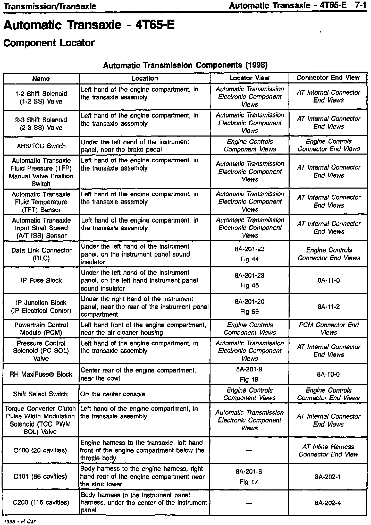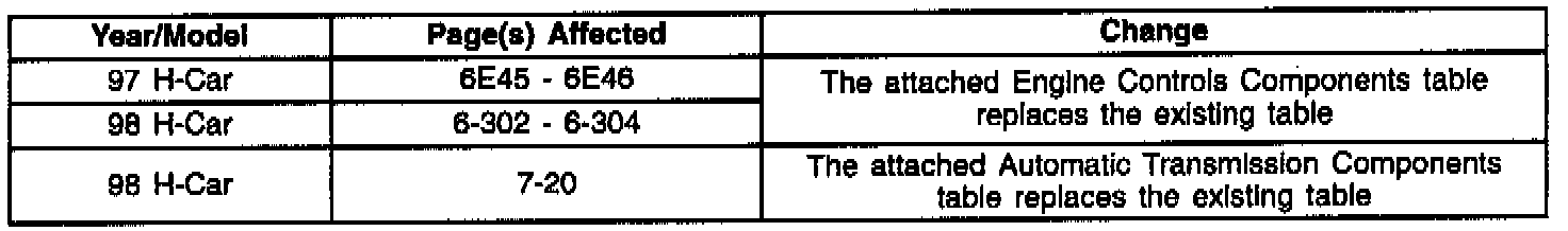 Sections 6 and 7 - Revised Component Location Tables for Engine Controls and Automatic Transmission