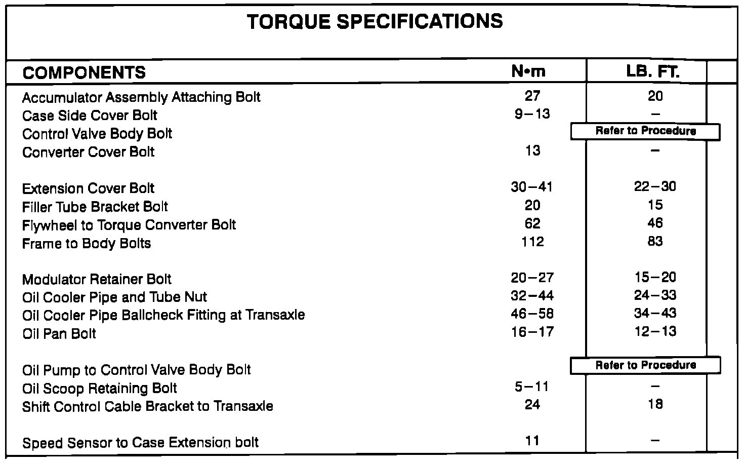TORQUE SPECIFICATIONSComponent Torque/Ft. Lbs.