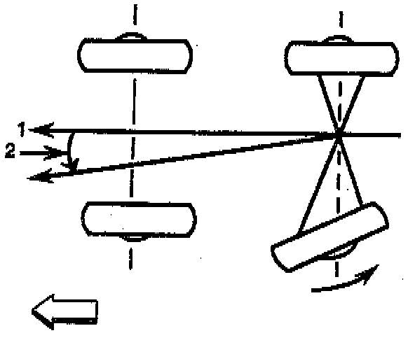 The front wheels aim or steer the vehicle. The rear wheels control tracking. The tracking action is relative to the thrust angle (2). Thrust angle (2) is defined as the path that the rear wheels will take. The thrust angle (2) should be aligned with the body centerline (1).