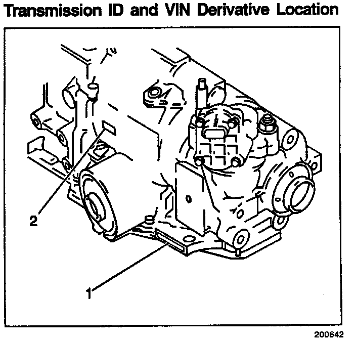 The transaxle VIN derivative number (1) is stamped into the horizontal cast rib on the RH rear of the transaxle housing, the transaxle ID nameplate (2) is located just forward of the VIN derivative as shown.