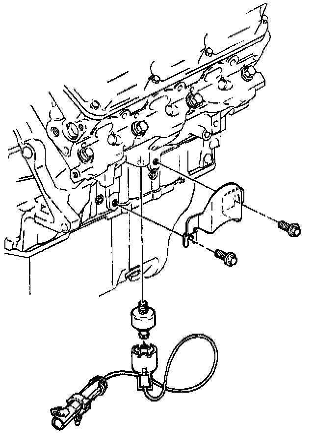 2. Install the knock sensor heat shield mounting bolt located under the freeze plug (or block heater if equipped).