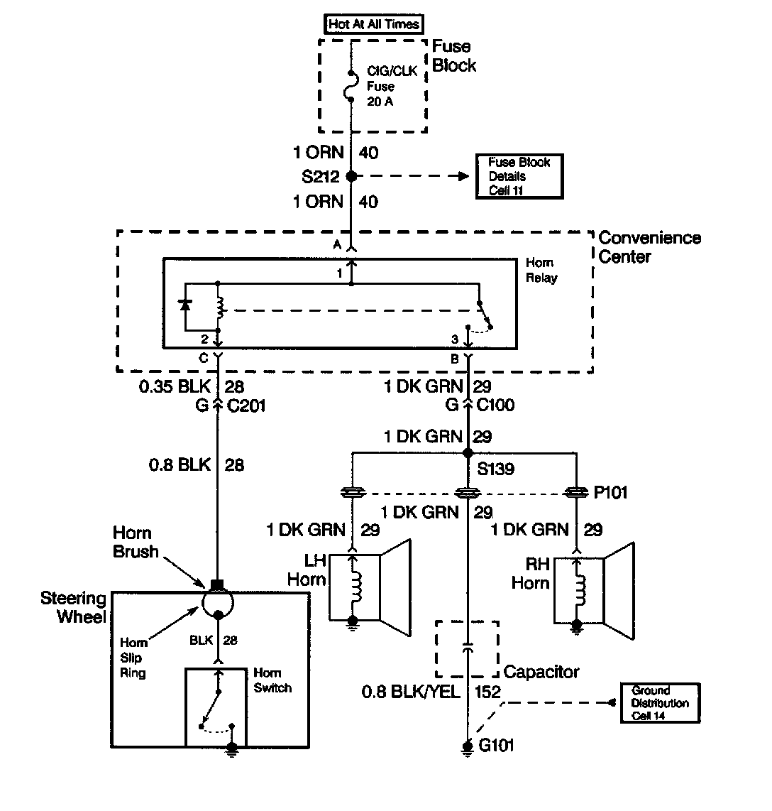 When diagnosing a horn problem use the service information located in the Horns service category. The following schematic is a typical example of a schematic with its supporting text.