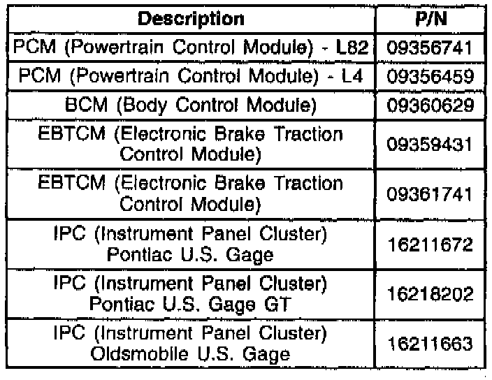 ^ PCM, BCM: The Technical Assistance Center will arrange for the shipment of a replacement PCM or BCM from GMSPO within 24 hours and provide a case reference number. The core information tag (for PCM) must be completely filled out and include a copy of the repair order (with the case reference number) to aid in product analysis. The dealership will receive a request for the returned part via the D.C.S. Refer to Warranty Administration Corporate Bulletin # 40-05-01C, dated September, 1998, for shipping instructions. The replaced part should be shipped to the following address: