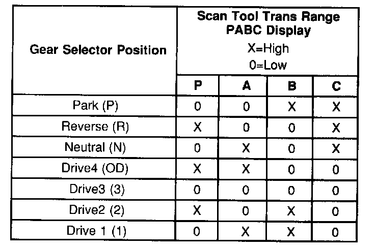 The combination of the four transaxle range input states determine the PCM commanded shift pattern. The input voltage level at the PCM is high (B+ -battery positive voltage-) when the transaxle range switch is open and low when the switch is closed to ground. The state of each input is represented on the scan tool as X=high voltage level, 0=low voltage level. The four parameters represent transaxle range switch Parity, A, B, and C inputs respectively.