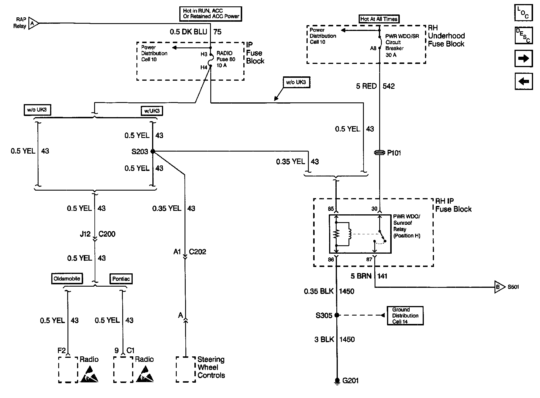 Retained Accessory Power (RAP) Schematics (Pontiac/Oldsmobile): RH Maxi Fuse Block:
