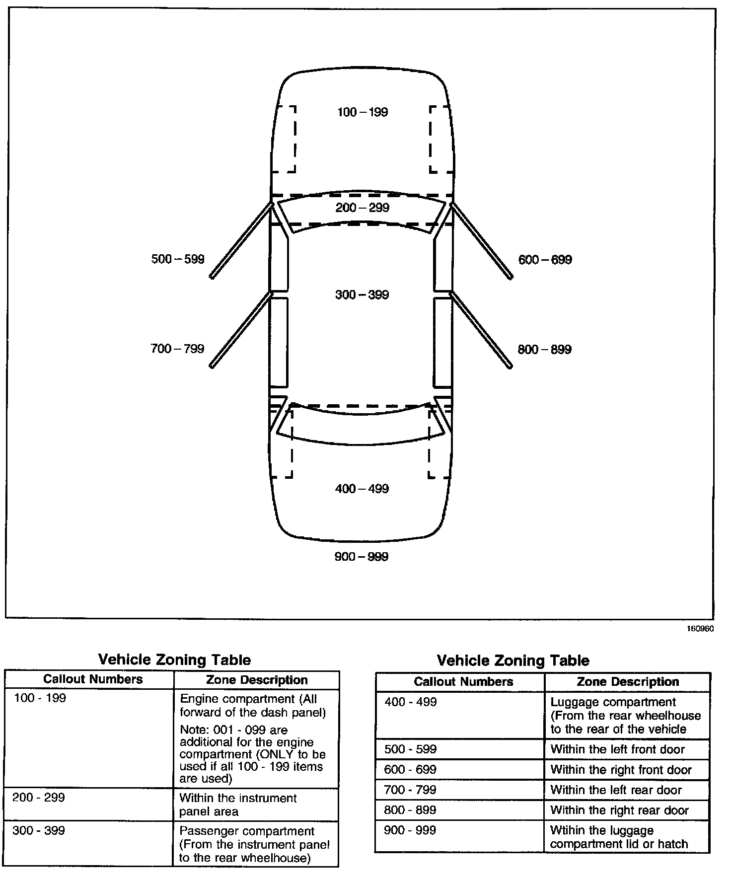 All grounds, in-line connectors, pass-through grommets, and splices have identifying numbers that correspond to where they are located in the vehicle. The following table explains the numbering system.