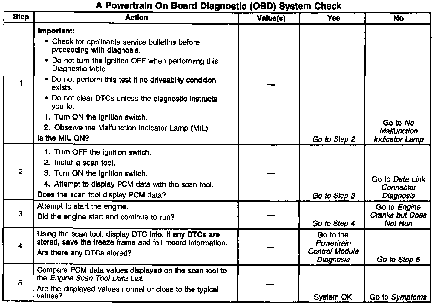 1. The Malfunction Indicator Lamp (MIL) should be ON steady with the key ON / engine OFF. If not, the No Malfunction Indicator Lamp table should be used to isolate the malfunction.