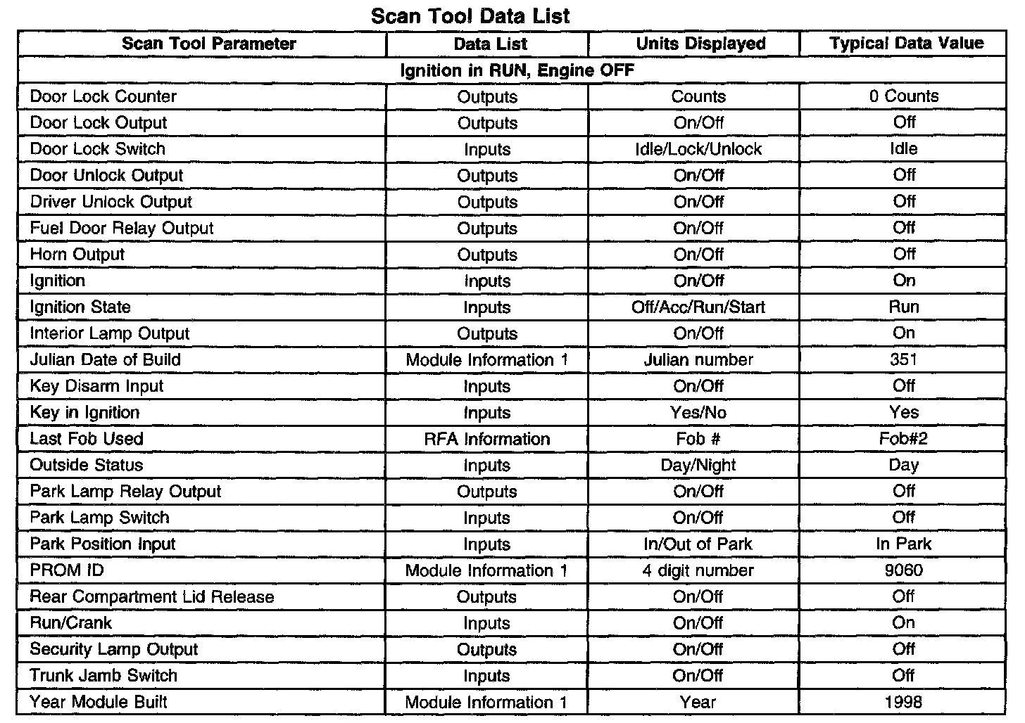 The Keyless Entry Scan Tool Data List contains all of the keyless entry related parameters that are available on the scan tool. The parameters in the list are arranged in alphabetical order. The column, Data List, indicates the location of the parameter within the scan tool menu selections. Use the Keyless Entry Scan Tool Data List as directed by a diagnostic table or in order to supplement the diagnostic procedures. Begin all of the diagnostic procedures with Diagnostic System Check - Remote Keyless Entry. Use the Scan Tool Data List only after the following is determined: