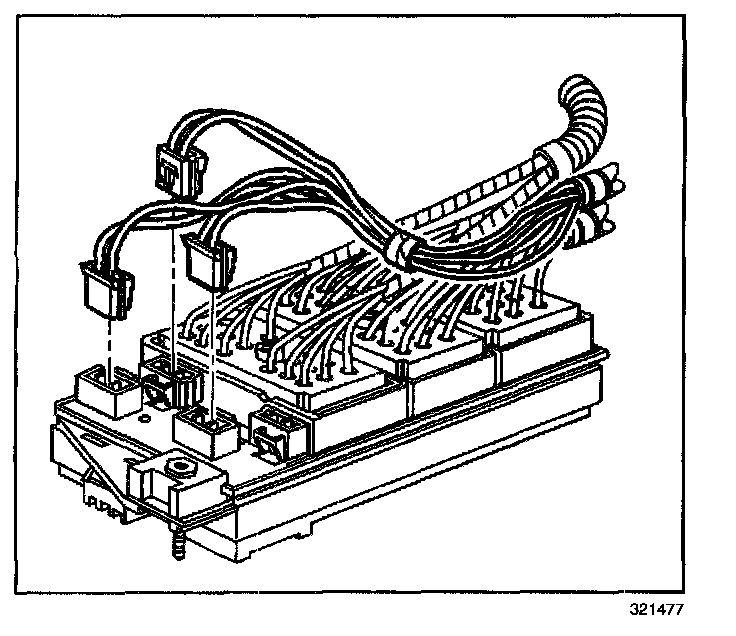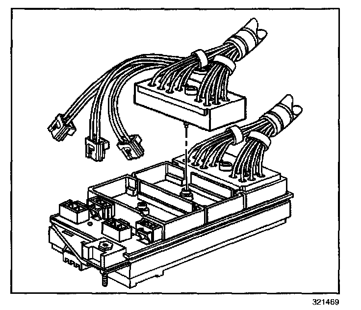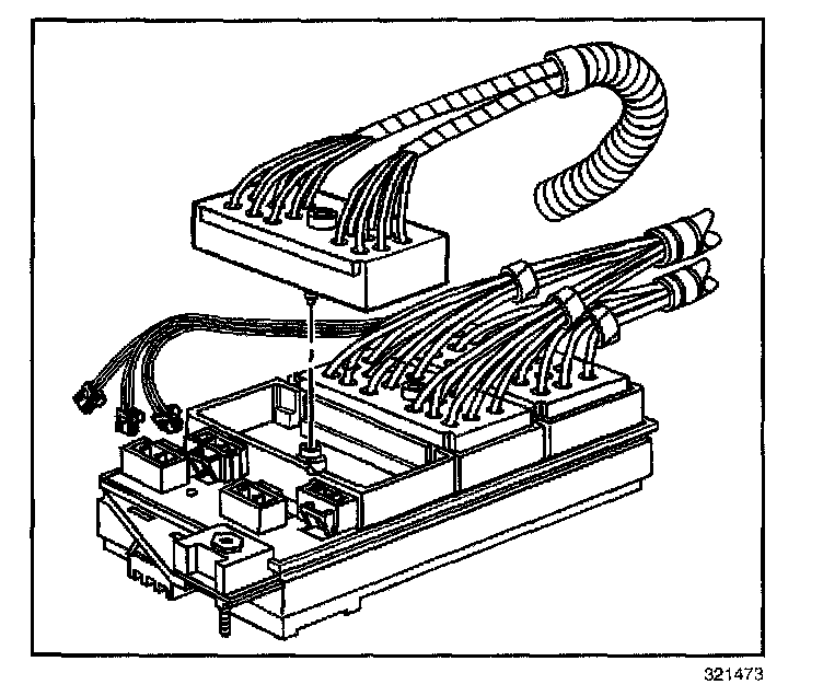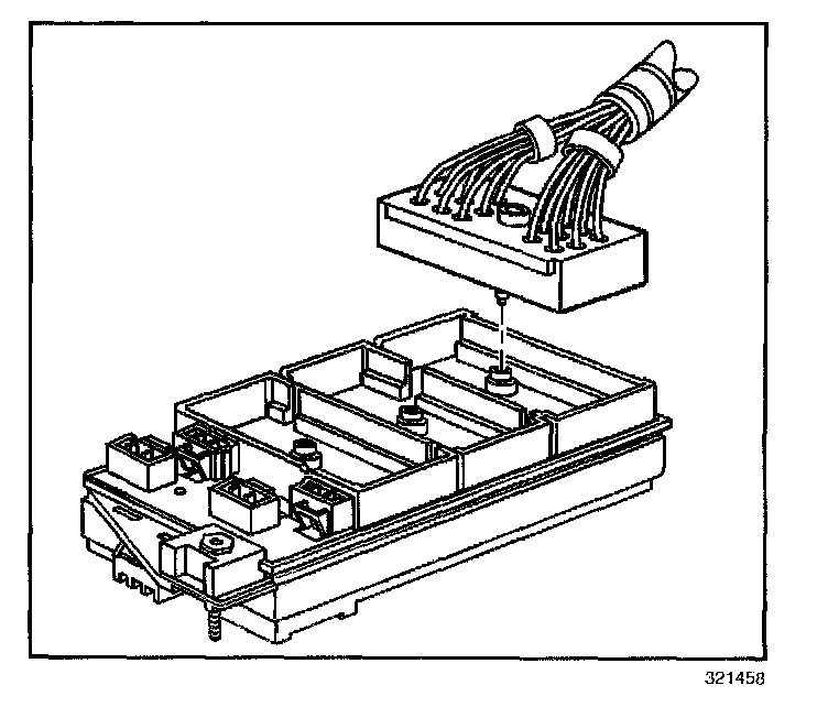 12. Loosen the bolts retaining the engine, IP, and forward lamp wiring harness connectors to the junction block.