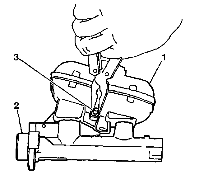 2. Remove the brake fluid level sensor (3). Using needle nose pliers, carefully depress the retaining tabs on the end of the brake fluid level sensor and press the sensor through the reservoir (1) to remove.
