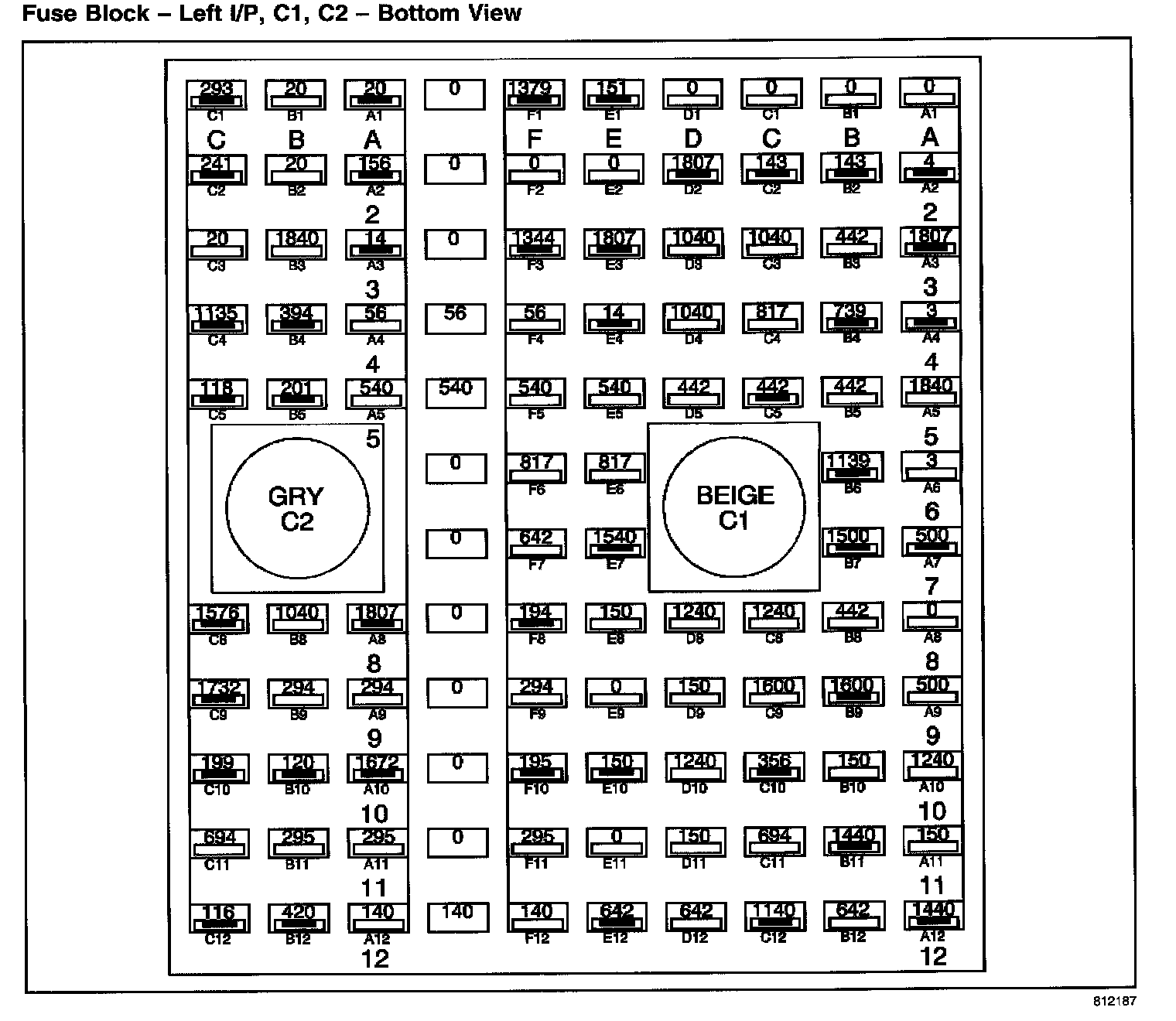 Fuse Block - Left I/P, C1, C2 - Bottom View: