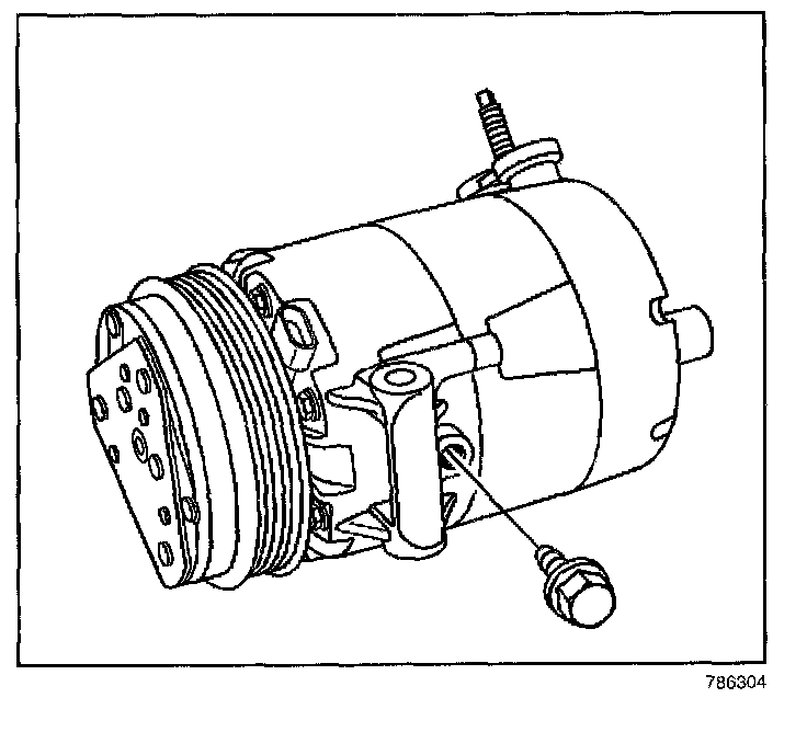 1. Drain the Pag oil from the new compressor into a clean calibrated measuring container. Drain from the crankcase and from the rear head ports. If the amount of old oil drained is less than or equal to 75 ml (2.5 oz), add 75 ml of new oil into the new compressor through the crankcase bolt hole.