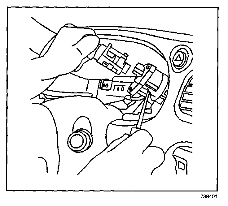 11. Remove the lock cylinder from the ignition switch, by depressing the retaining tab and pulling the cylinder out with the key.