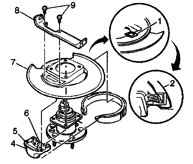 1. Install the park brake shoe and actuator (4) onto the backing plate (7).