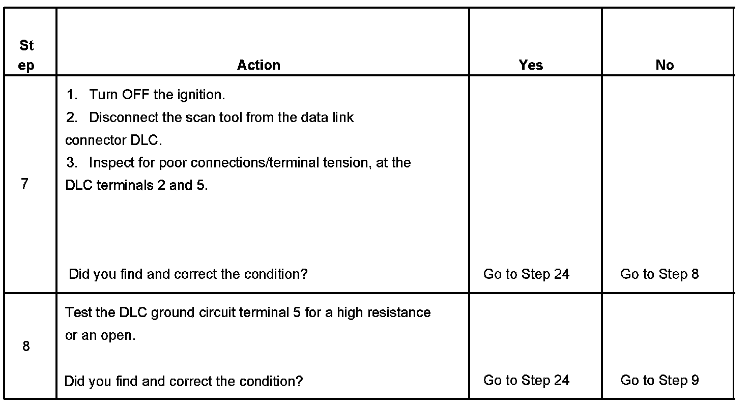 7. Data link connector (DLC) terminals 2 and 5 provide the connection from the vehicles Class 2 serial data circuit and the Tech 2. A poor connection at this connector could cause corrupted data transmissions between the two devices. Pin 2 is the signal terminal and pin 5 is the signal ground terminal.