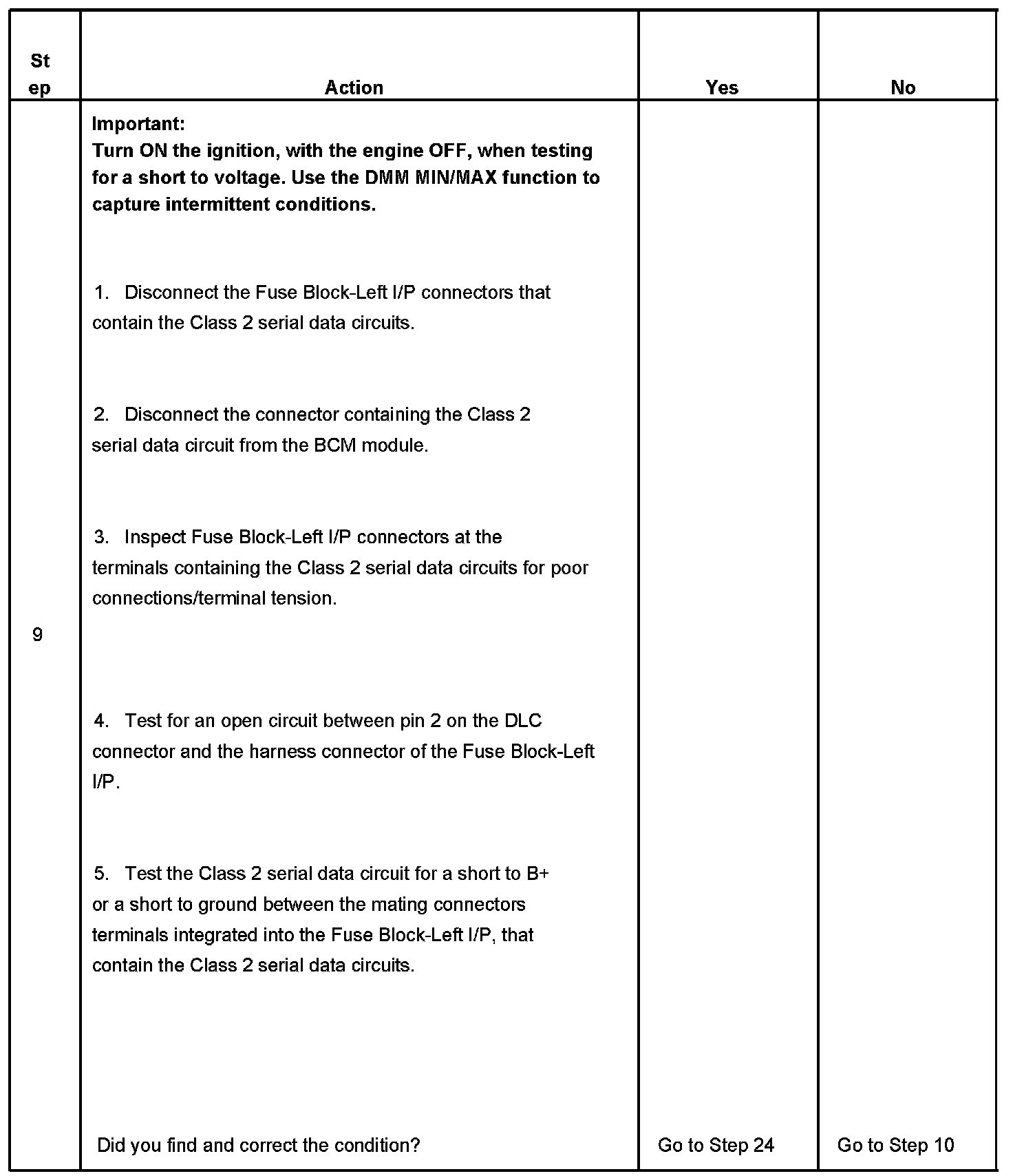 9. This step tests for an open from pin 2 of the DLC connector and the Fuse Block-Left I/P harness connector, it also tests for a short to B+ and Ground between the Fuse Block-Left I/P stationary junction terminals.