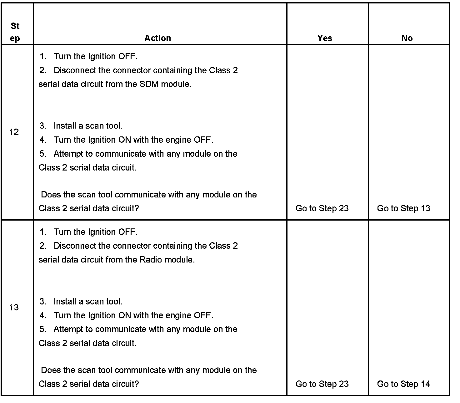 12. This is an active test of the Class 2 serial data circuit with the SDM isolated from the communication bus. If you are able to communicate with the Class 2 serial data circuit during this step, the SDM should be replaced.