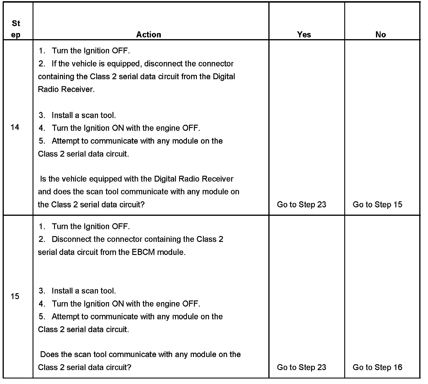 15. This is an active test of the Class 2 serial data circuit with the EBCM isolated from the communication bus. If you are able to communicate with the Class 2 serial data circuit during this step, the EBCM should be replaced.