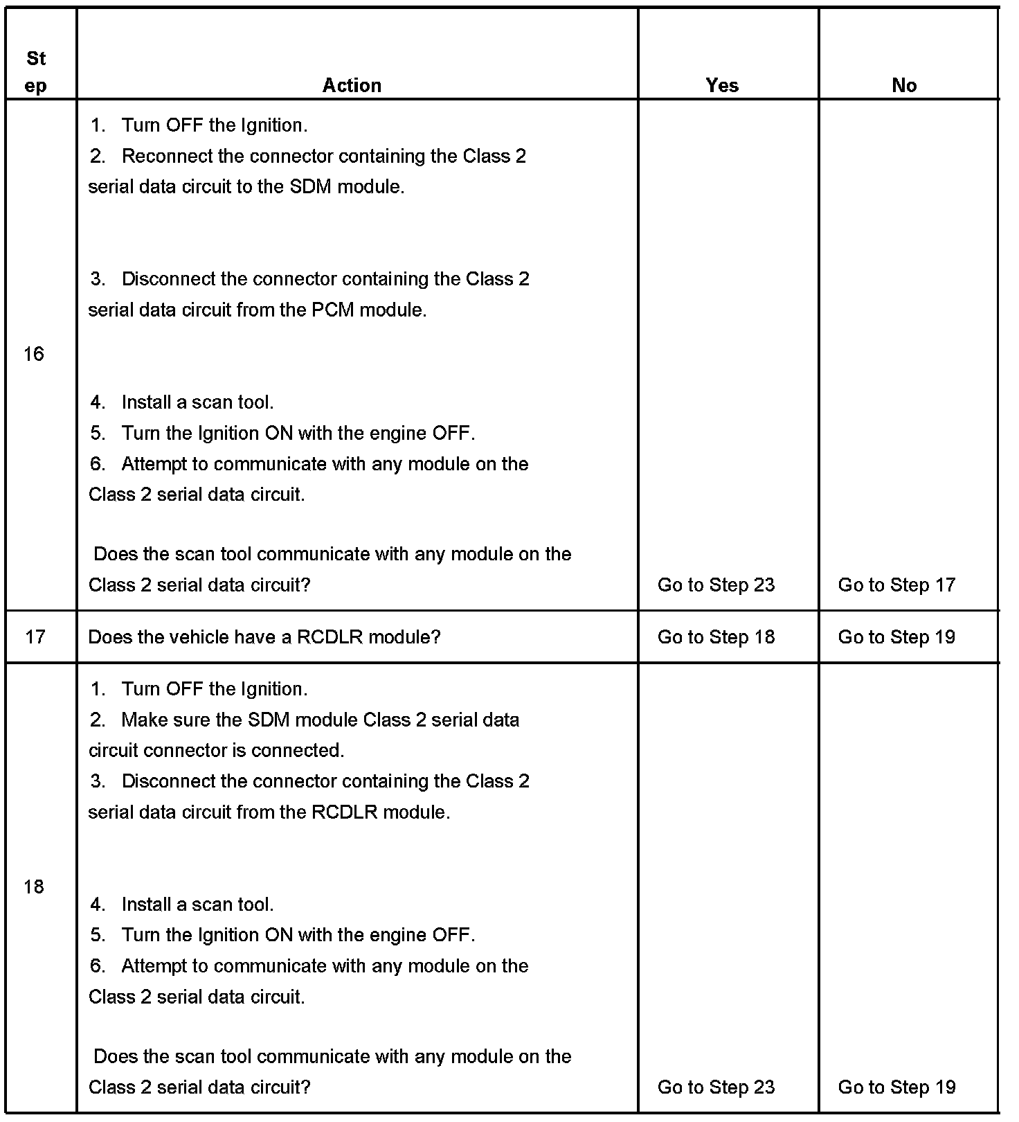 16. This is an active test of the Class 2 serial data circuit with the PCM isolated from the communication bus. If you are able to communicate with the Class 2 serial data circuit during this step, the PCM should be replaced. The SDM is reconnected to allow at least one possible module for the Tech 2 to communicate with.