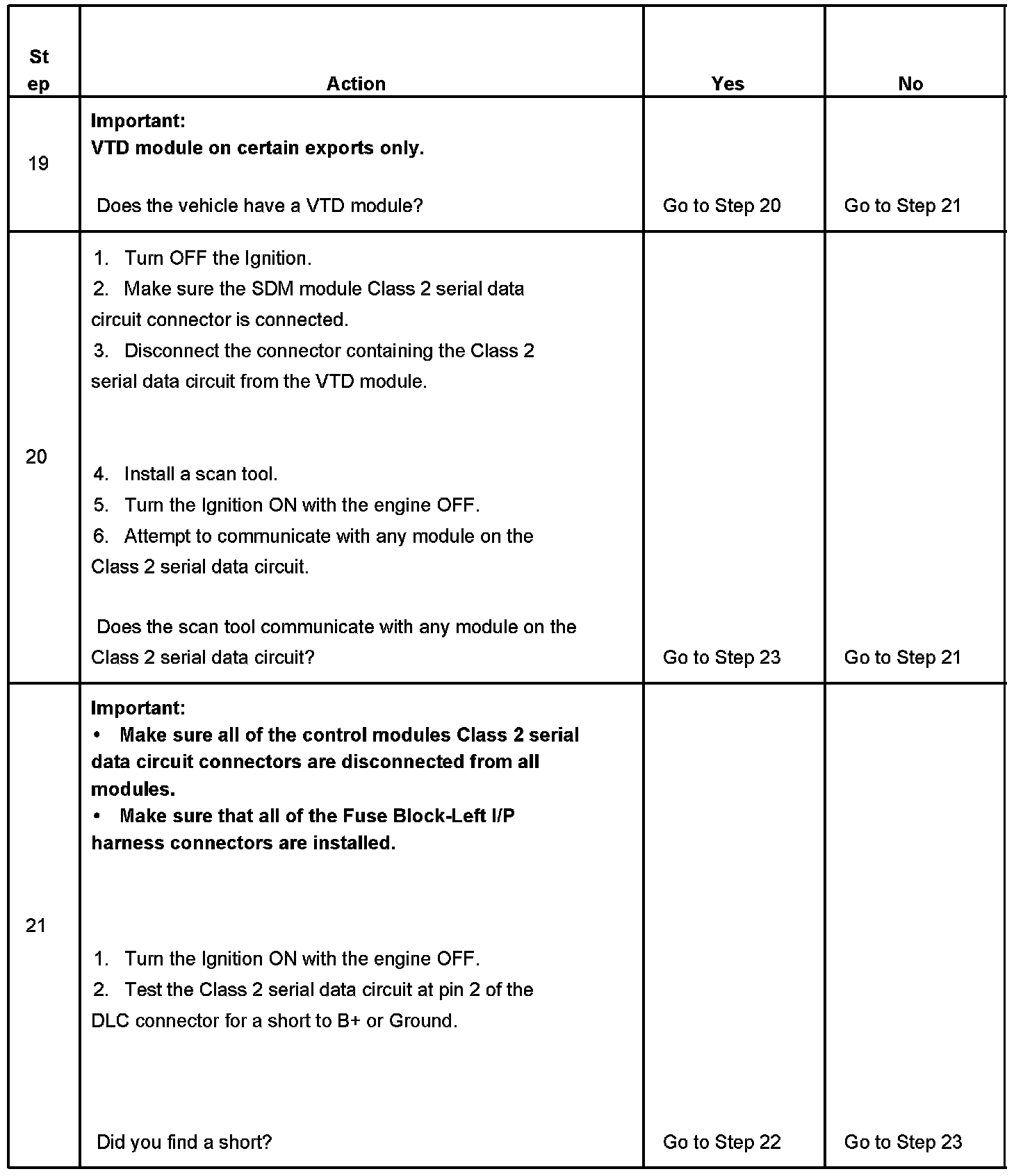 20. This is an active test of the Class 2 serial data circuit with the VTD, if the vehicle is equipped, isolated from the communication bus. If you are able to communicate with the Class 2 serial data circuit during this step, the VTD should be replaced.