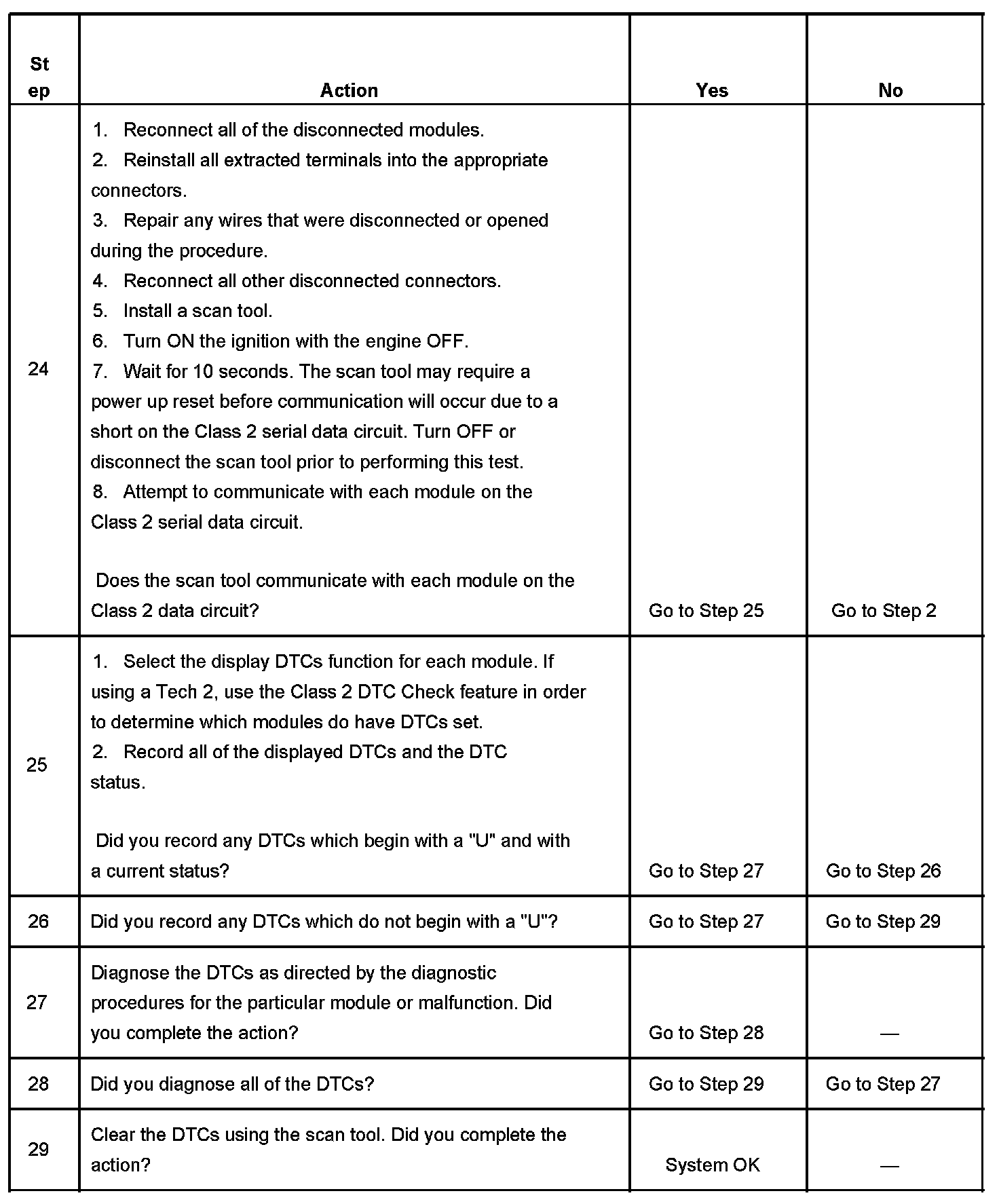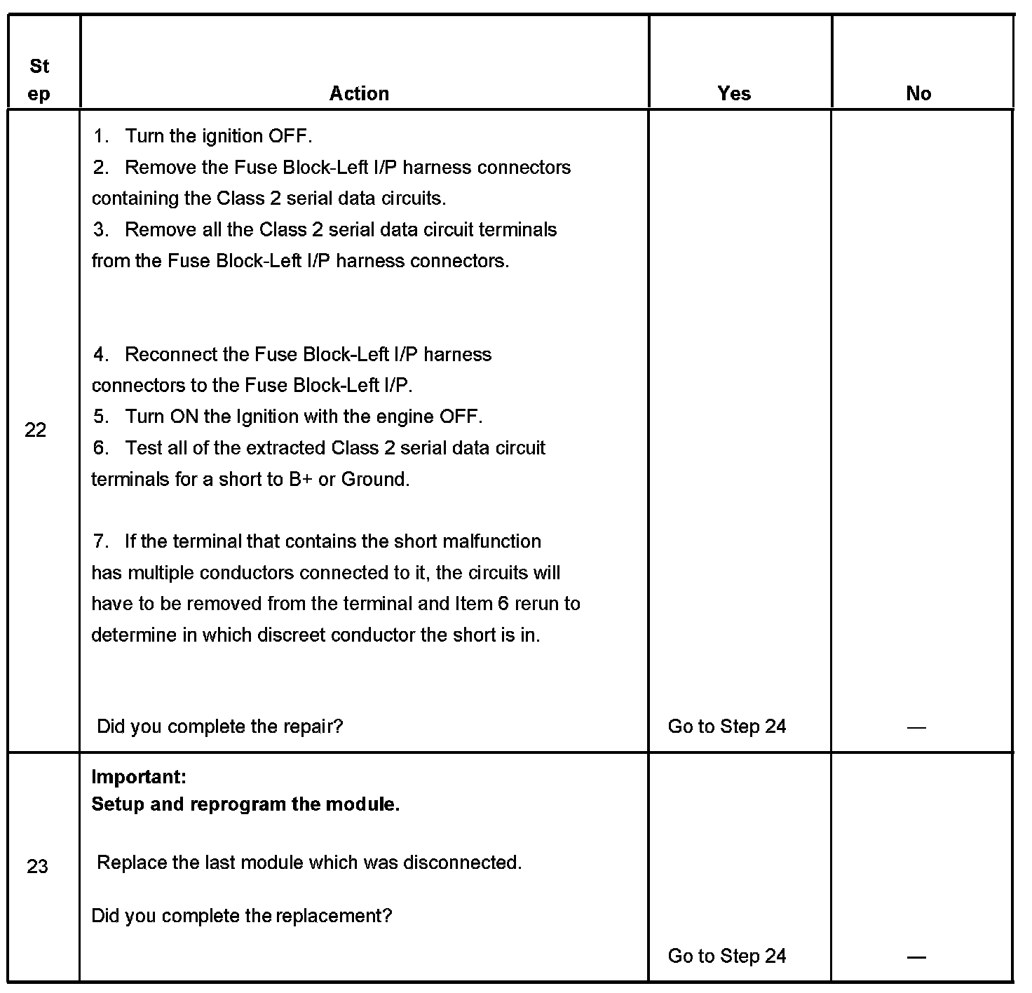 22. In this step instructions are given to analyze each branch of the Class 2 serial data circuit, in order to isolate the cause of the short.