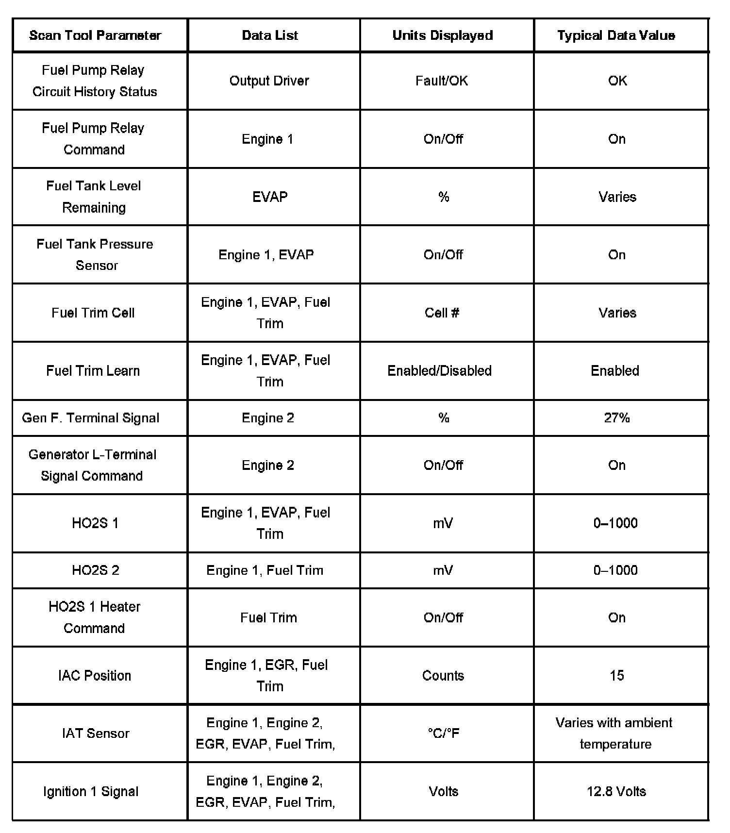 - Engine Data 1-Contains general information regarding fuel delivery, idle air control (IAC) position, heated oxygen sensor (HO2S1), HO2S2, and other basic engine operating conditions.
