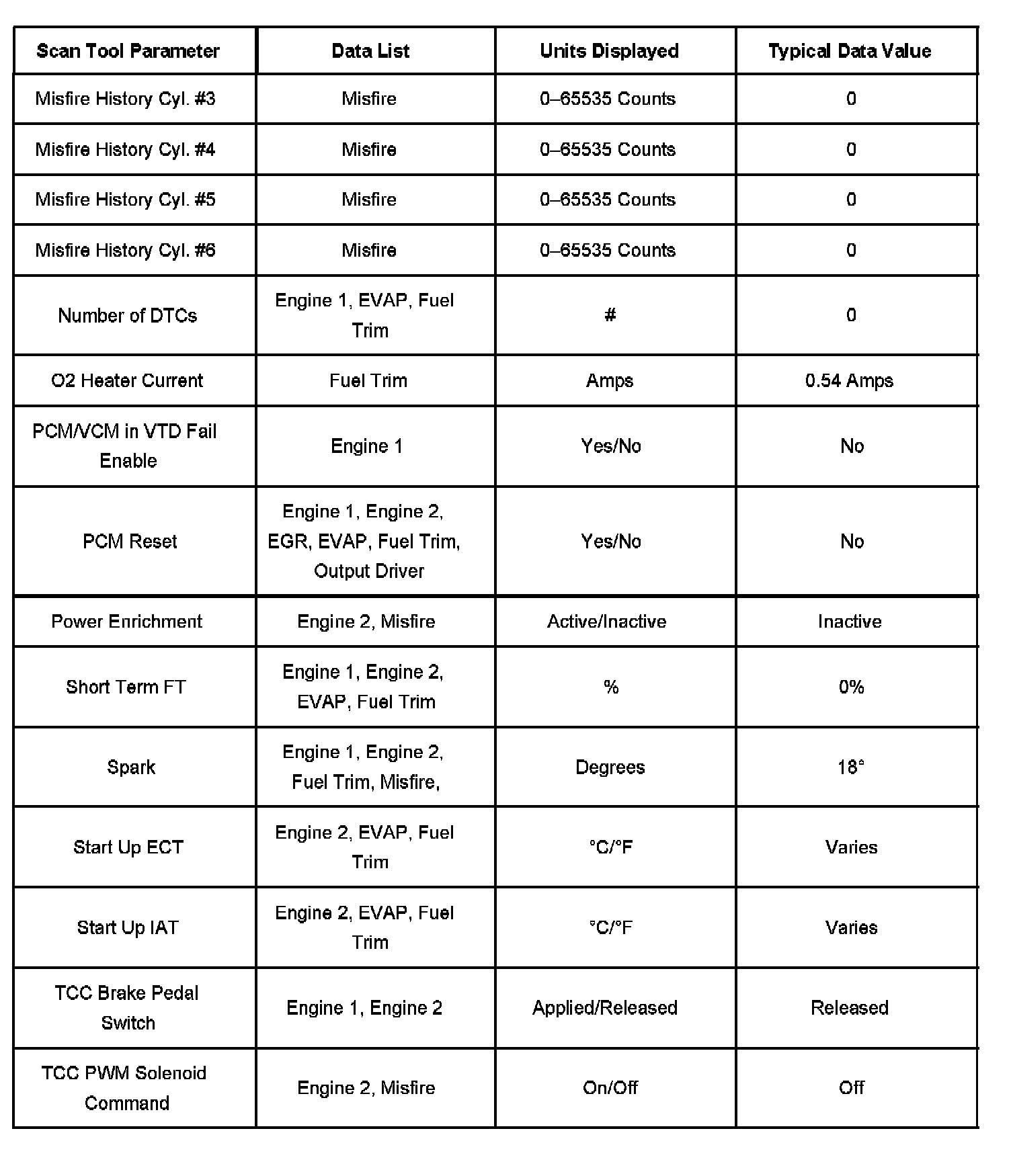 Only the parameters listed below are referred for use in diagnosis. For further information on using the scan tool to diagnose the powertrain control module (PCM) and related sensors, refer to the applicable reference listed below. If all values are within the typical range described below, refer to Symptoms - Computers and Control Systems. The Typical Scan Data Values table contains all the parameters included in the following data lists arranged in alphabetical order: