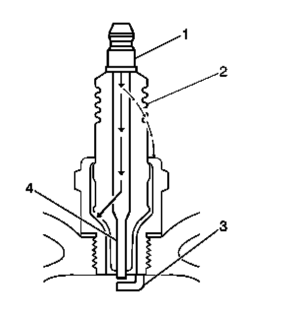 - Inspect the insulator (2) for cracks. All or part of the electrical charge may arc through the crack instead of the electrodes (3, 4).
