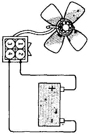 1. Disconnect fan motor connector and connect to battery positive to terminal 2, and battery negative to terminal 4.