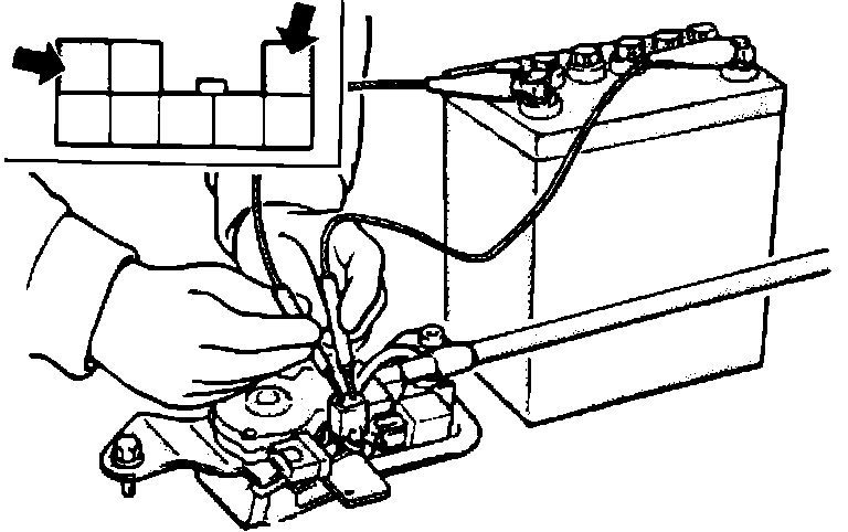 2. Connect the terminals of the automatic seat belt wiring harness connector to the battery as shown. Ensure motor operates smoothly.