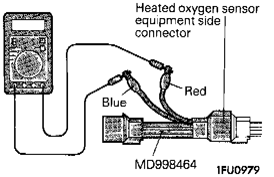 2. Make sure that there is continuity [Approx. 20 Ohms at 20°C (68°E)] between terminals 1 (red clip of the special tool) and terminal 3 (blue clip) on the heated oxygen sensor (front) connector.