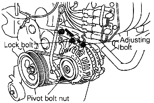5. After adjusting the belt tension, fully tighten the nut of the pivot bolt and the lock bolt to the specified torque, and then tighten the adjusting bolt to the specified torque.