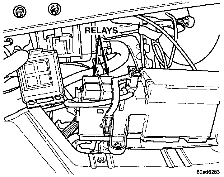 The ASD relay and fuel pump relay are located in the Power Distribution Center (PDC). A decal on the inside of the PDC covers shows the locations of each relay and fuse contained in the PDC.