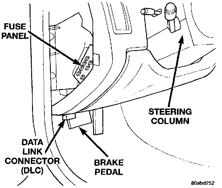 The data link connector (diagnostic connector) links the DRB scan tool with the Powertrain Control Module (PCM). The data link connector is located inside the vehicle, below instrument panel next to the center column.